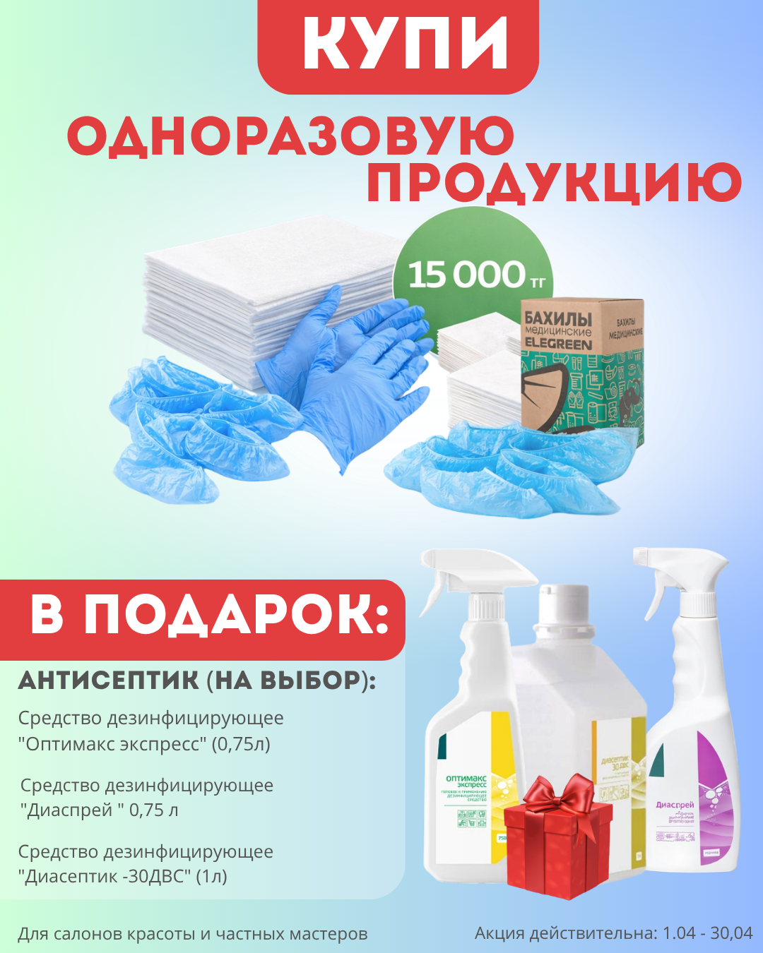 Купи любую ОДНОРАЗОВУЮ ПРОДУКЦИЮ на сумму от 15 000 тг, получи в подарок средство для дезинфекции