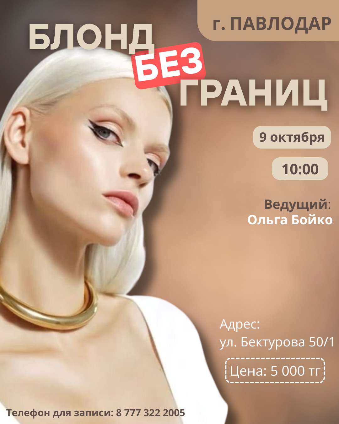 БЛОНД БЕЗ ГРАНИЦ, г. Павлодарmanager12 октября 2025 Ведущий: Ольга Бойко Адрес: ул. академика Бектурова, 50/1Стоимость: 5 000 тгТелефон: 8 777 322 2005